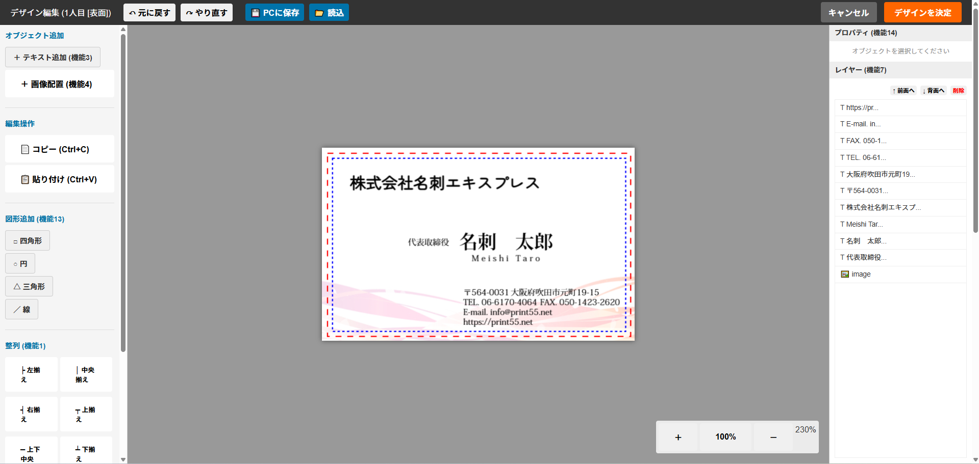 文字の大きさや色、フォント、字間、図形の挿入、画像の挿入、画像のレイヤー順位や透過等、細かくご自分で名刺をデザインできます。